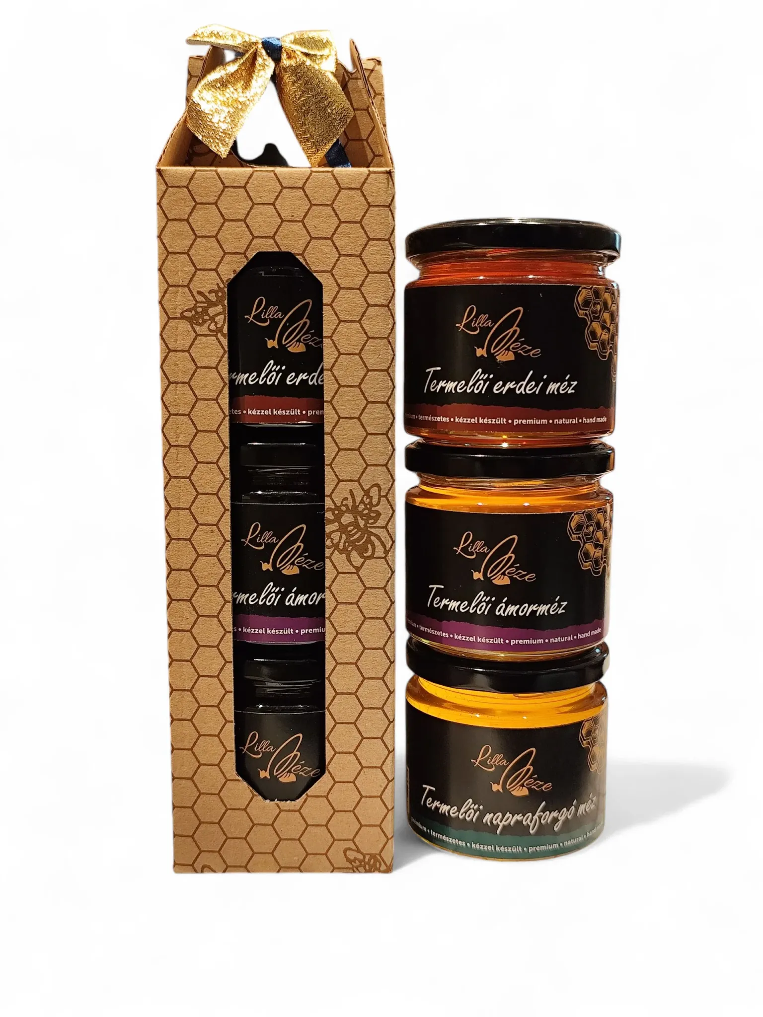 Nem akarsz bort vinni ajándékba? Vagy a bonbon már túl unalmas? Akkor ez a mézválogatás garantáltan sikeres lesz. A díszdoboz formája olyan mintha egy üveg bor lenne benne, de mégsem, mert 3 különböző méz tornyosul egymásra design üvegekben. A teljességet pedig a szalaggal átkötött mézcsurgató adja, így egy komplett ajándéknak örülhet az aki kapja. Magánszemélyeknek és cégeknek egyaránt.